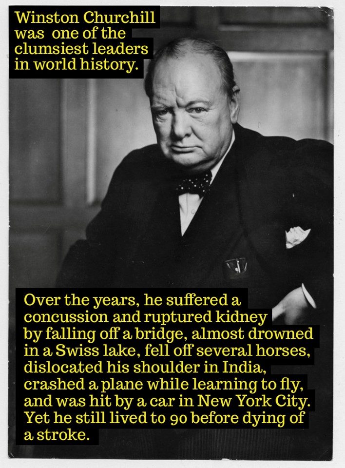 ▼邱吉爾是歷史上最笨拙的領導人之一。他曾摔下橋造成腦震蕩、腎臟破裂;差點在一處瑞士湖畔溺斃;從馬上摔下幾次;在印度期間肩膀脫臼;學開飛機時墜毀了一架飛機;在紐約期間被車撞。但他活到了90歲,最後死於中風。