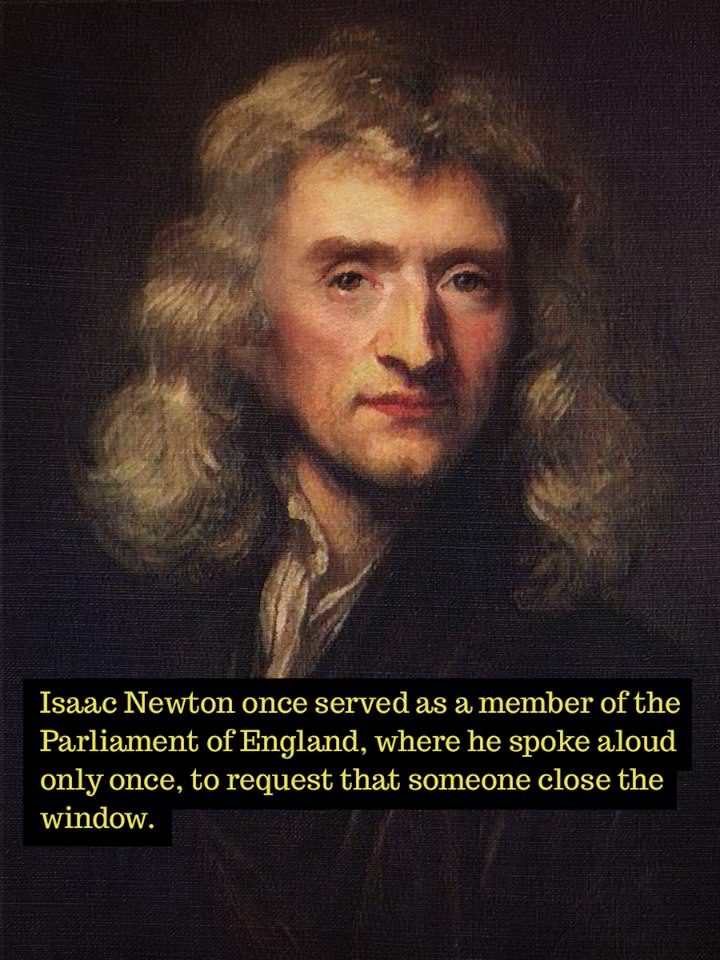 ▼牛頓曾任英格蘭議會成員,他很少發言,唯一發言的一次是要求某個人關窗戶。
