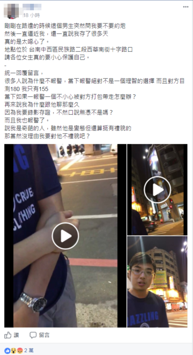 ▼有網友質疑為什麼不馬上報警,她回應說「對方目測180公分,我只有155公分,萬一報警就被對方打包帶走怎麼辦?我跟他聊那麼久是要錄影存證,不然事後也是口說無憑,而且我事後也報警了」。女生的做法也受到了網友們的肯定,立即報警可能會激怒對方,反而對自己不利,隨機應變穩住對方情緒,再司機蒐證逃走,才是比較好的應對方法。(點我看影片)