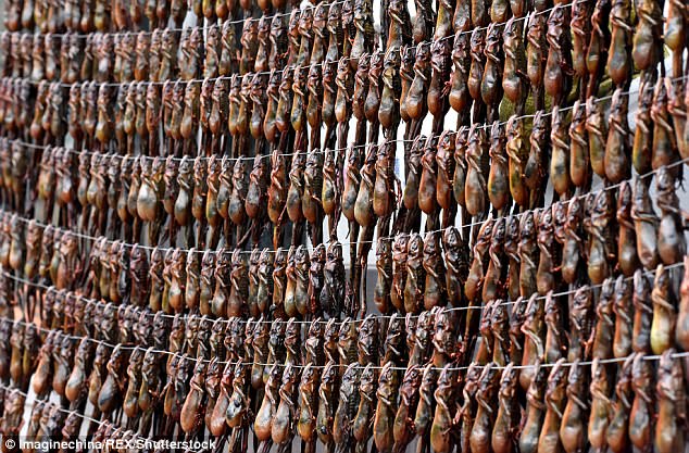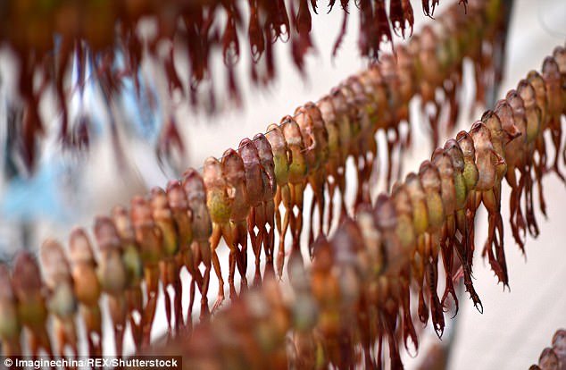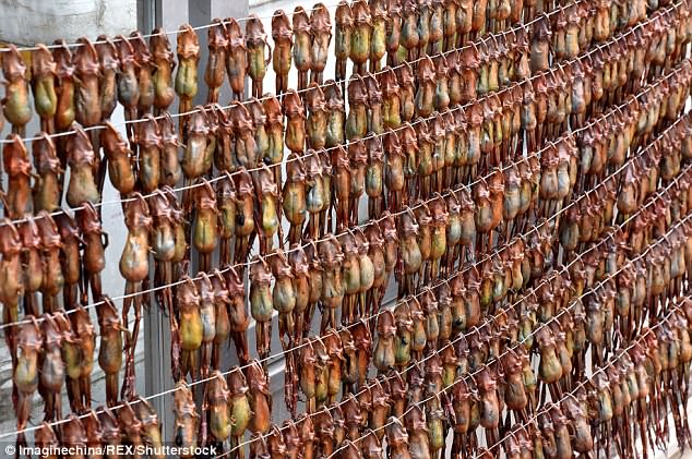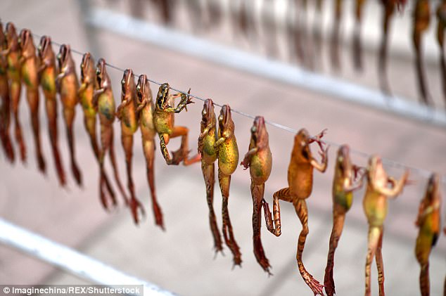 活生生的林蛙被串起來晾曬,真的很殘忍啊!
