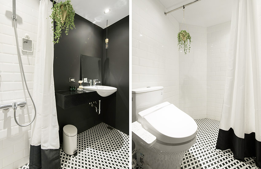 ▼淋浴間:浴室外部牆面是深灰色乳膠漆,內部則是黑白牆面,層次分明。夾層烤漆玻璃不透光,能夠保護隱私,還能讓空間更開闊。