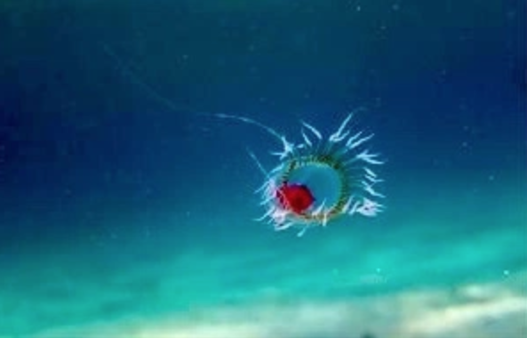 ▼燈塔水母:燈塔水母最初只是小小的幼蟲,最後會形成水螅型的菌落。菌落崩裂分離後,會形成獨立、性成熟的個體。這種水母變老或生病時,可以重新回到水螅型狀態。從理論上講,這種成長和回歸的過程可以無限重復下去,也就是「永生」!