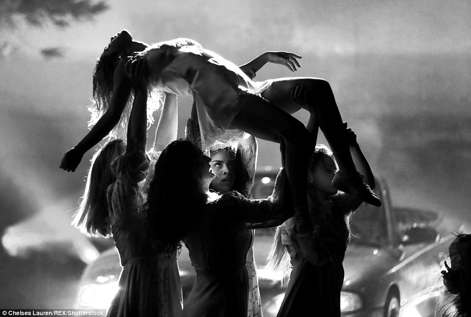▼那天她穿著性感白色睡衣演唱「Wolves」,身上的特別化妝看起來就像受傷了一樣。