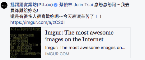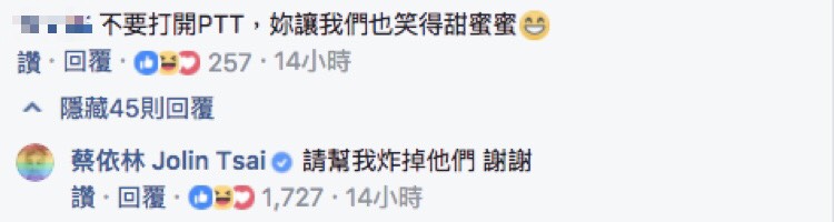 ▼底下也有網友安慰說:「不要打開PTT,妳讓我們也笑得甜蜜蜜。」蔡依林則展現高EQ回應:「請幫我炸掉他們,謝謝。」讓PTT的小編現身滅火說:「息怒息怒啊~我去買炸雞給妳吃!還是有很多人喜歡妳呢~今天表演辛苦了!」並貼出許多讚美蔡依林的言辭,表示還是有網友肯定她功力。
