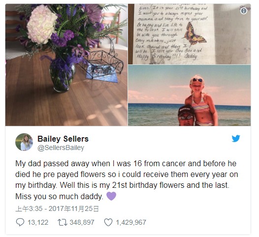 ▼麥克(Michael William Sellers)在過世前預定了許多花束,讓女兒貝麗(Bailey Sellers)能夠在21歲之前每一年的生日裡都收到來自父親的祝福。