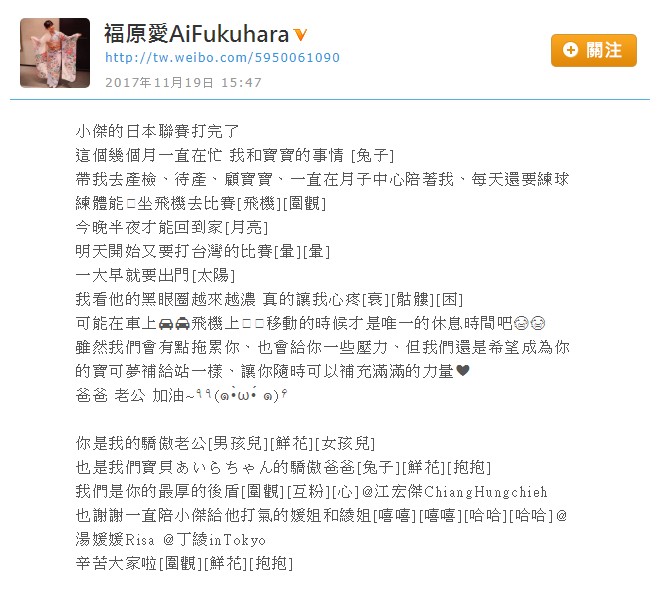2017年11月28日可愛的日本桌球名將「福原愛」與台灣選手江宏傑結婚之後,兩人的舉動都十分受到兩岸三地的粉絲所關注。不久前福原愛成功誕下了可愛的女兒,初為人母的她經常在社群媒體上分享自己的喜悅。不過幾天前她疑似有感而發,在微博發了一篇動態讓許多粉絲都心痛了。