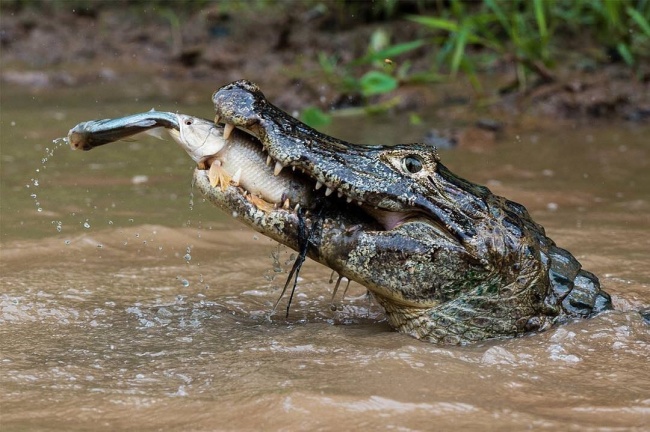 ▼鱷魚抓住了一條正在吃另一條魚的虎魚。