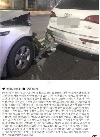 ▼這件事引起了很多人的關注,目擊者的拖板車司機卻表示,脖子受傷的計程車司機是因為要處理車輛保險問題,才決定留在現場,請救護人員先行離開的。太妍因為安全氣囊爆開而胸口疼痛,嚇得發抖還關心其他車主和乘客。她沒有乘坐救護車,甚至沒有靠近救護車,是等經紀人到現場後,才搭對方的車去的醫院。