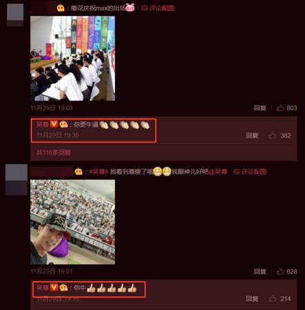 ▼吳尊直接在大合照上打「有沒有看到我家人?」粉絲們立刻開始尋找,還有人圈出重點,說:「我看到尊嫂了。」吳尊服氣讚美:「你牛!」還有網友從另一張側拍照中揪出Max坐在媽媽大腿上,低頭玩手指的畫面。吳尊忍俊不禁:「你更牛逼!!」