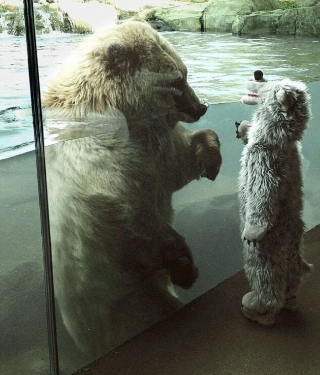 ▼北極熊被身穿北極熊裝的小孩所吸引了。