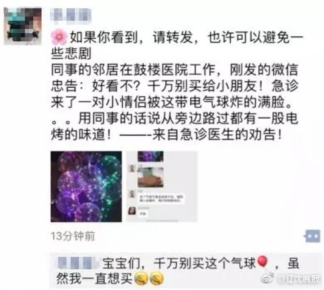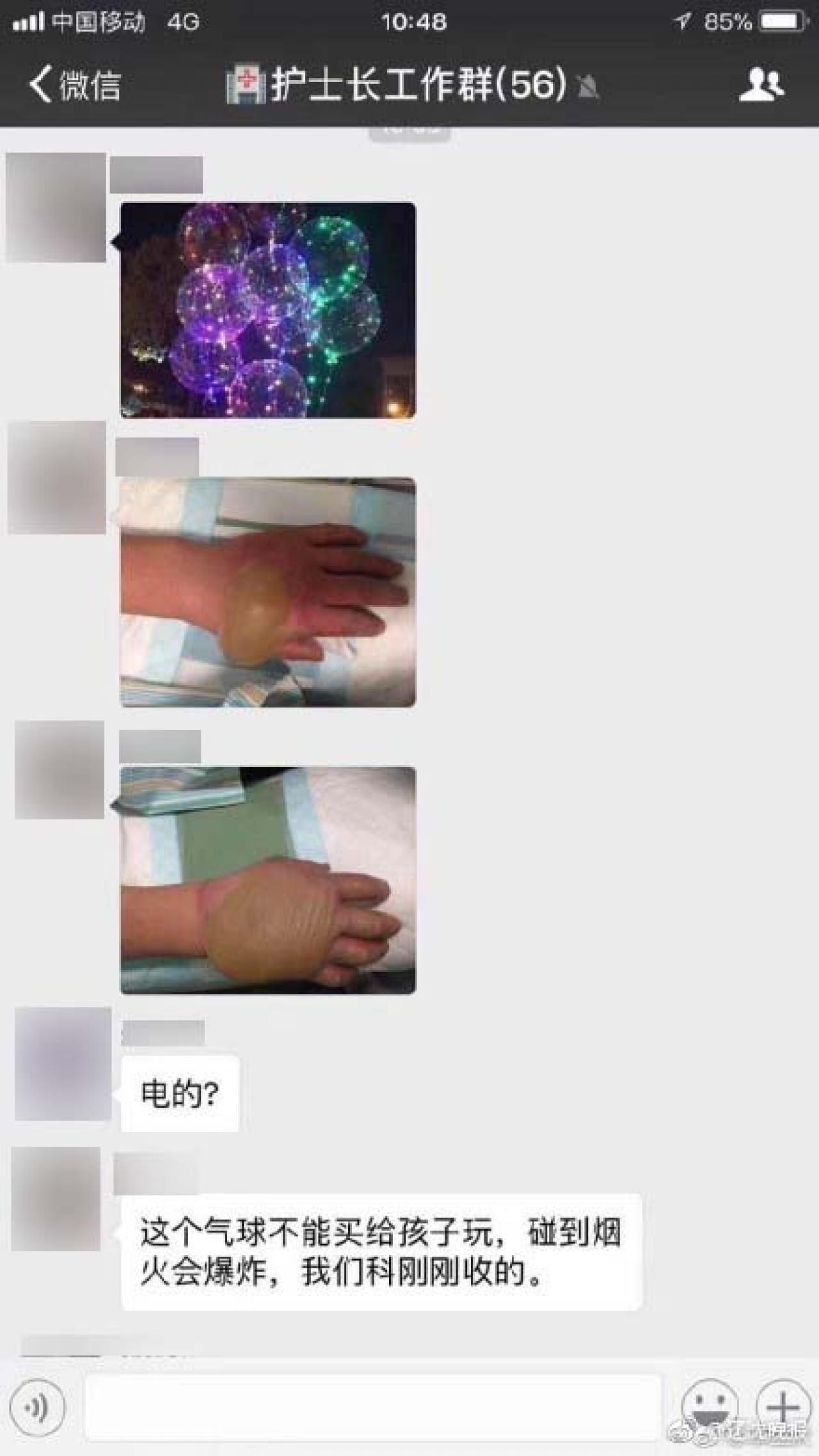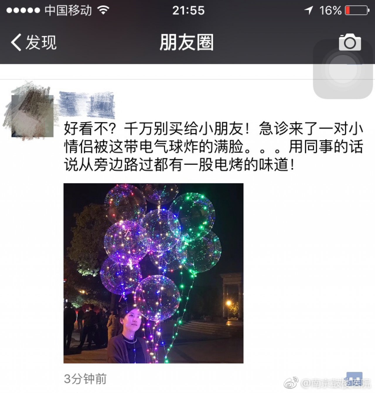 ▼不過這樣的發光氣球卻有極大隱憂,一位在南京鼓樓醫院的護理人員爆料說,醫院日前收到了4個被發光氣球炸傷的病患。原來有2男2女買了6個發光氣球上計程車,一位男性在車上點煙,隨即「砰」的一聲,引爆一顆氣球,接著抱在懷中的氣球也連環爆!