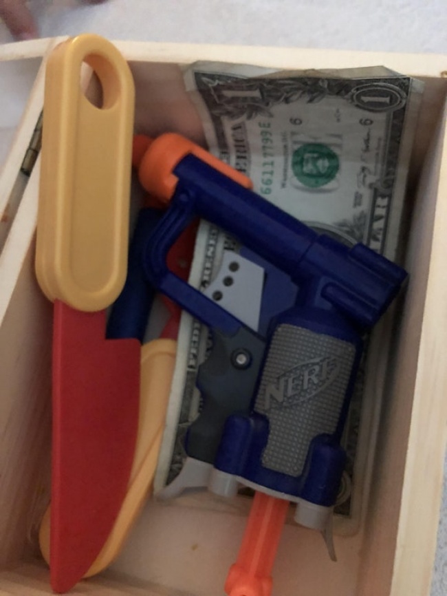 ▼3歲女兒的秘密寶箱裡裝著刀、槍、現金,現在有點緊張了。