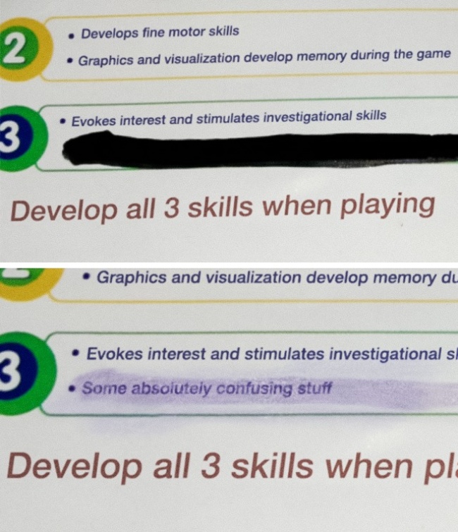 ▼給小孩買了一款遊戲,其中「發展技能」的某一行被塗掉了,原來那一行是「一些讓人超級困惑的東西」。