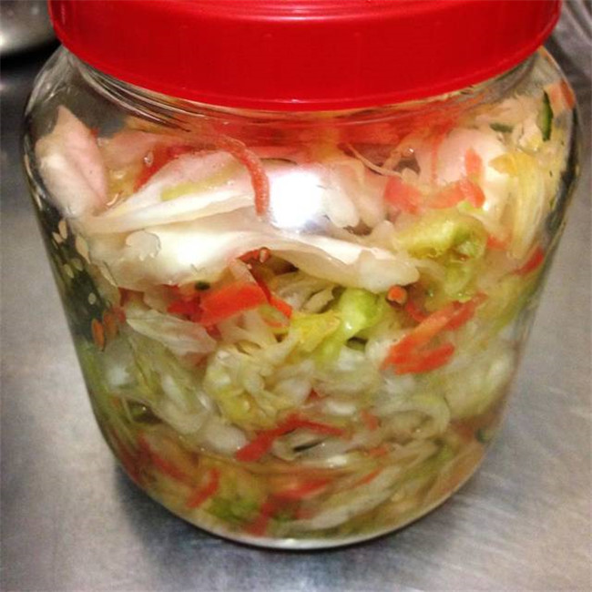 ▼把混合好的菜裝進乾淨的玻璃罐中,倒入事先晾好的糖醋水,放入冰箱冷藏12個小時候即可食用。