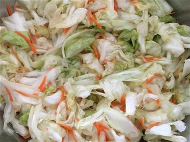 ▼把高麗菜和胡蘿蔔放入乾淨的容器中,混合后加入鹽巴,醃製一個小時左右,會發現高麗菜瀝出很多水分,把水倒掉,加入辣椒攪拌。