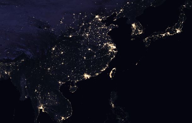 ▼看看台灣,西側亮如白晝,燈光連成一片,比周圍的國家都要亮。