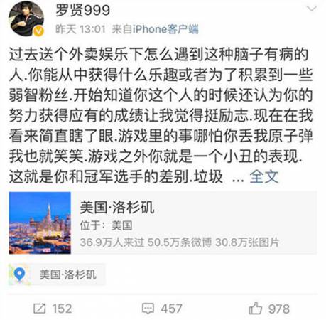 ▼羅賢在事後得知這件事情之後,在自己的微博表示「這就是一個小丑的表現」,還怒嗆對方是「垃圾」,引起許多中國網友也跟著湧入對Larva謾罵,之後主辦單位也宣佈禁止Larva參加所有索泰主辦的賽事。