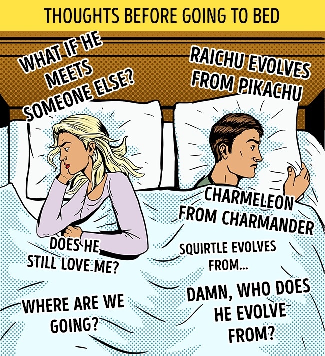 ▼女生睡前在想:「他還愛我嗎?我們會走向何方?如果他偷吃呢?」男生睡前在想:「皮卡丘進化成雷丘、小火龍進化成火恐龍、傑尼龜是什麼進化來的?」