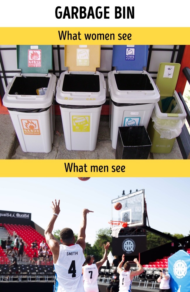 ▼女生眼中垃圾桶就是垃圾桶,男生眼中垃圾桶是籃框。