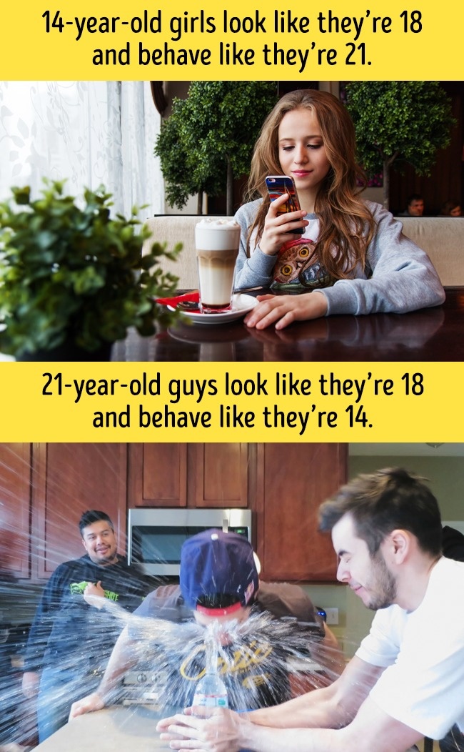 ▼14歲的女生看起來像18歲,行為舉止像21歲;21歲的男生看起來像18歲,行為舉止像14歲。