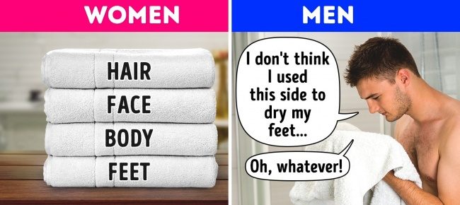 ▼女生的毛巾分為擦頭、臉、身體、腳,男生:「我好像沒用這部分擦腳吧……隨便啦!」
