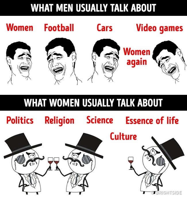 ▼男性的話題:女人、足球、車、還是女人、電動;女性的話題:政治、宗教、科學、文化、生命本質。