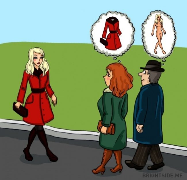 ▼看到美女,女生在意的是漂亮衣服,男生在意的是好身材。