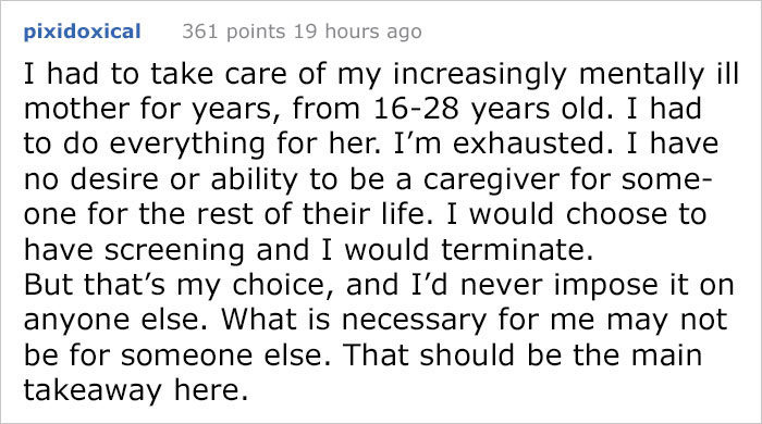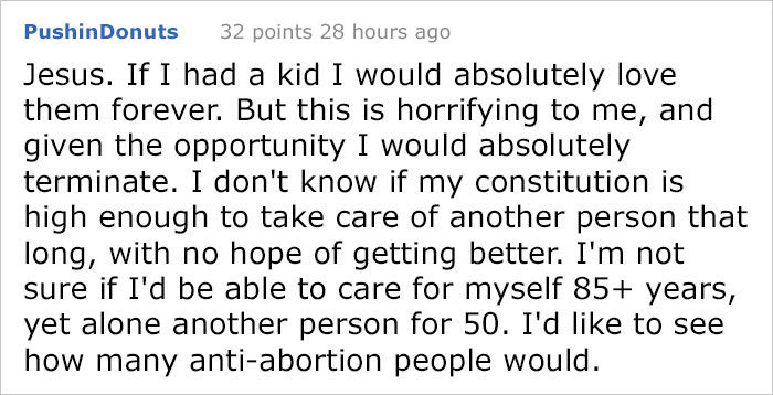 ▼不過也有人認同墮胎:「天哪,如果我有小孩,我一定會永遠愛他,但唐氏症寶寶對我來說太可怕了,如果可以選擇的話我會墮胎,我不知道自己能不能照顧他那麼久,他永遠不會好起來。我不確定自己85歲以後還要照顧另一個50歲的人。多少人反對墮胎?」