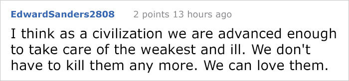 ▼「我認為身為文明人,我們應該能夠照顧弱小和生病的人,不用非得把他們殺死,我們可以去愛他們。」