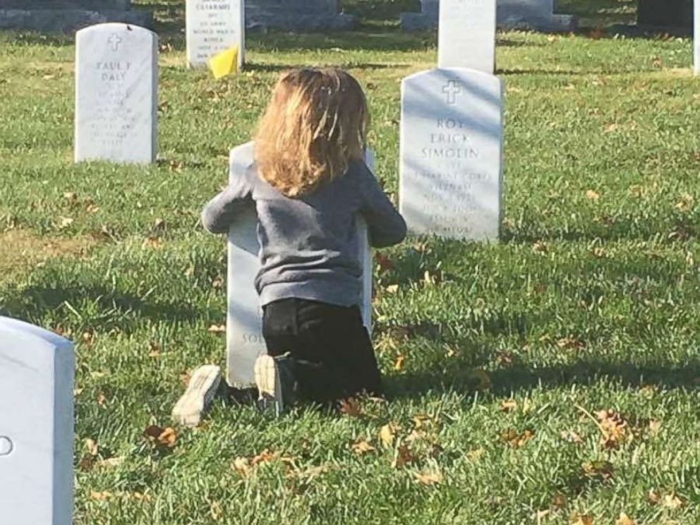 ▼Alfred下葬在阿靈頓國家公墓。兩個小孩在墓碑前鋪上毯子,趴在上面與爸爸聊天。Mason好像在祈禱,Mylay則在打瞌睡,他說他能感受到爸爸,想和爸爸一起小睡一下。