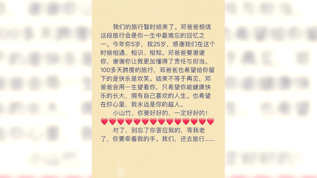 ▼《爸爸5》節目收官後,鄧倫在微博上PO出「給閨女的一封信」,表示短暫的旅行結束,相信這段旅程會是小山竹一生中最難忘的回憶之一。他感性說:「今年妳5歲、我25歲,感謝我們在這個時候相遇、相識、相知,謝謝妳讓我更懂得責任與擔當。」最後他提醒小山竹:「別忘了你答應我的,等我老了,你要牽著我的手,我們…還去旅行…..」