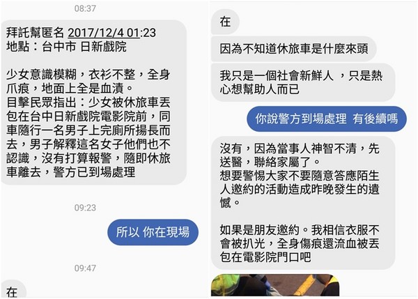 2017年12月11日本月4日有女網友在「爆料公社」匿名po文,凌晨1時23分在台中日新戲劇院門口發現一名醉酒女子。倒在路邊的女子已經醉倒,衣衫不整的她身上到處都是觸目驚心的抓痕,地上還有血跡。