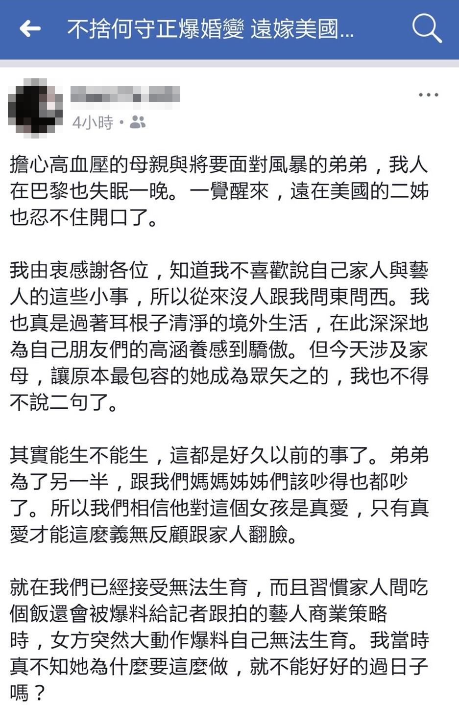 ▼眼看弟弟變成眾矢之的,何守正遠在美國的親姊何桂育也PO文說,其實小嫻「能不能生」是很久之前的事了,還爆料弟弟何守正曾為此跟家人大吵,「所以我們相信他對這個女孩是真愛,只有真愛才能這麼義無反顧跟家人翻臉。」