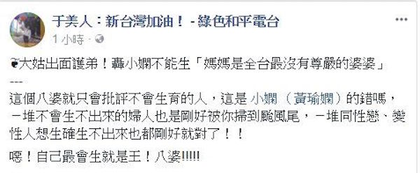 ▼于美人也罵說:「這個八婆就只會批評不會生育的人,這是小嫻的錯嗎?」抱怨其他無法生育的人完全被掃到颱風尾,更怒轟:「噁!自己最會生就是王!八婆!」網友也紛紛替小嫻抱不平,直呼:「小嫻買房子給你們住,房子不還人家嗎!真是吃人夠夠。」