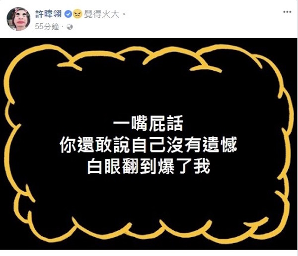 ▼不過與小嫻要好的女星卻紛紛跳出來發聲,徐小可在私人臉書表示:「一嘴屁話,你還敢說自己沒有遺憾,白眼翻到爆了我!」黃小柔也在底下留言:「想要全身而退的一堆廢話!太醜陋了~」徐小可更回覆說:「看了報導我一堆火!」