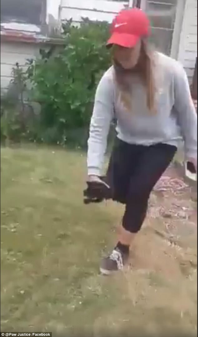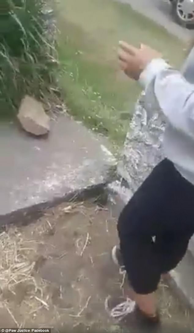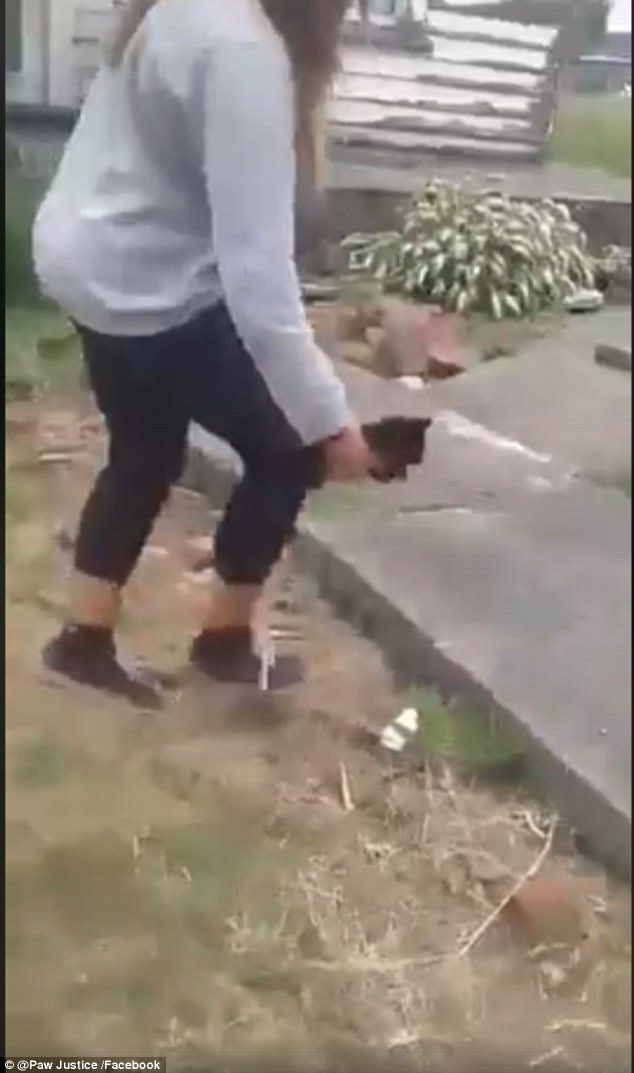 ▼這個女生將小貓抱起來之後狠狠往地上摔,之後還用水泥土塊往牠身上砸去。