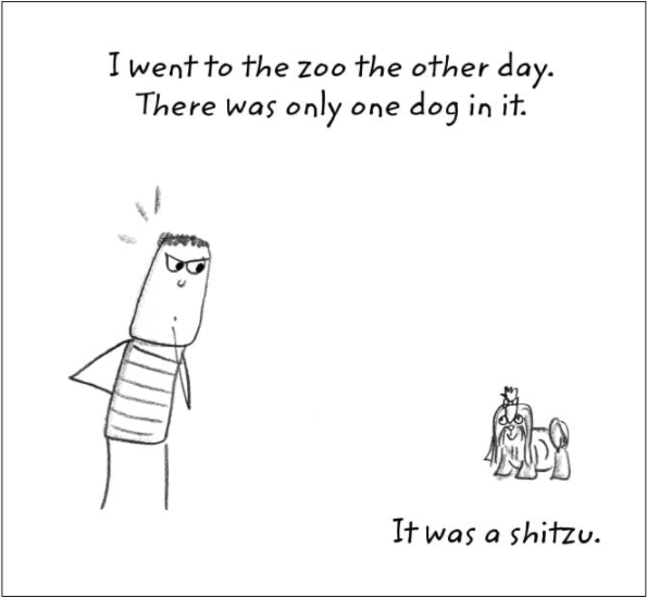 ▼「不久前我去動物園,那裡只有一隻狗狗。」「那是隻西施犬(Shit Zoo糟糕的動物園)。」