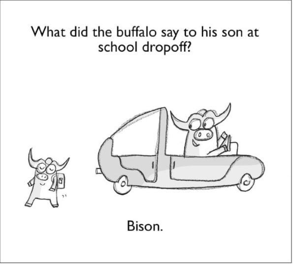 ▼「兒子下車去上學時,水牛對牠說了什麼?」「再見兒子!(Bye Son和Bison野牛同音)」