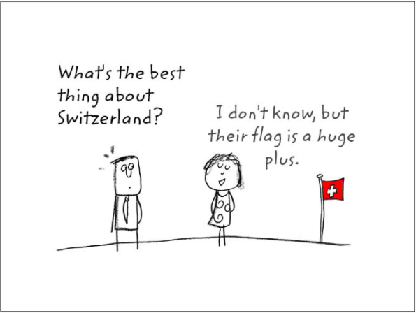 ▼「瑞士什麼最好?」「我不知道,但他們的國旗很『加』分。」