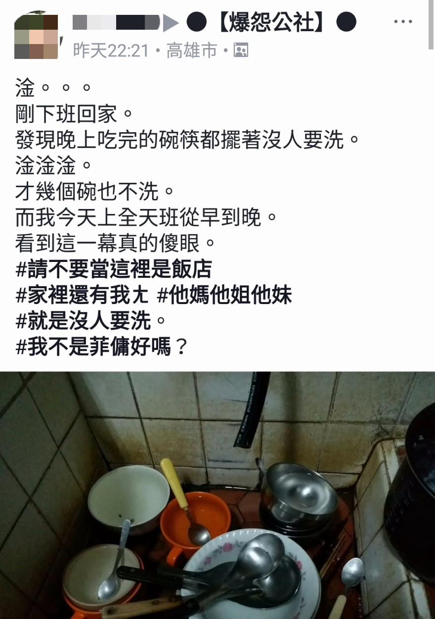 很多媳婦都遇到過這種事:辛苦工作一天,下班回家還要做家務,待在家裡的人寧願玩手機也不幫忙。最近,一名女網友在「爆怨公社」PO文說:「剛下班回家,發現晚上吃完的碗筷都擺著沒人要洗,淦淦淦!才幾個碗也不洗!而我今天上全天班從早到晚。看到這一幕真的傻眼。」