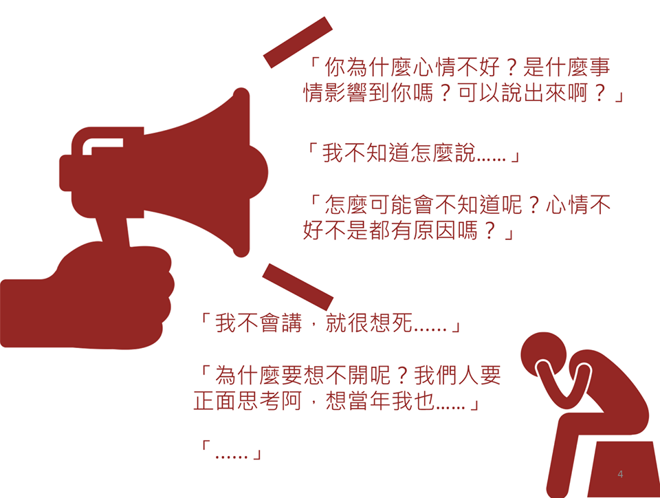 ▼憂鬱症的情緒是很複雜的,是長期以來負面經驗的積累,不是一兩件小事造成的。原因太多,他們自己也無從說起。陪伴者壓力太大時,可能會說出很多違心的話,比如「去呀去呀!管你是要上吊還是割腕,如果你這麼不珍惜自己的生命就去吧」、「如果你真的想死的話就去死好了,不要在那邊假鬼假怪」。這些話反而會讓憂鬱者陷得更深,他們會覺得自己「果然」是沒有人愛的。他們不停說死亡,總想著自殺,甚至推開身邊的人,其實真正需要的是大家的關心。