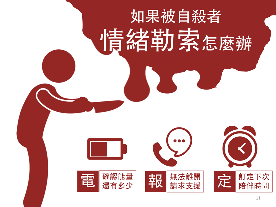 ▼如果自殺者告訴你「你不要過來,你再過來我就死給你看」、「你知道我在做什麼嗎?我在吞安眠藥喔,或許再三個小時我就會不省人事了……」你首先要確認自己還有多少電,如果自己都沒電了,就先安頓自己,再去解決問題;請求支援,找其他人幫忙;如果你真的沒辦法提供協助,就真誠說出自己的難處,同時也要提醒自己,你很在乎他,但不論是他的情緒或是他的生命,都不是你的責任,而是他自己的責任。