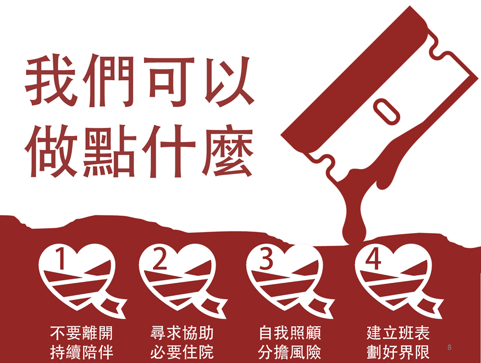 ▼如果你身邊有憂鬱者,他拿起來準備傷害自己,你該怎麼做呢?首先是不要離開,持續陪伴,你可以說一些話分散他的注意力,不要讓他傷害自己或傷害別人,如果情況失控,就打電話請求協助;尋求協助,必要時安排住院,也許病人抗拒住院,但他們病了,治療很重要;自我照顧,分擔風險。不要把照顧病人的責任壓到一個人身上,找病人的親友幫忙;建立班表,劃好界限。照顧病人很辛苦,你沒辦法24小時陪著他,確保自己有電,才能給他充電。