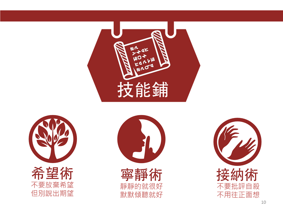 ▼希望術:不要放棄希望,但不要說「你會好起來的。」、「這只是暫時的」、「一切都會變好,你再多努力一下就好」之類的話,這會給患者造成壓力;寧靜術:有時候你講很多話去開導他,只是為了減緩自己的焦慮罷了,靜靜陪伴就很好;接納術:不要用批評表達你的關心,你越接納他,他才越能夠冷靜下來。