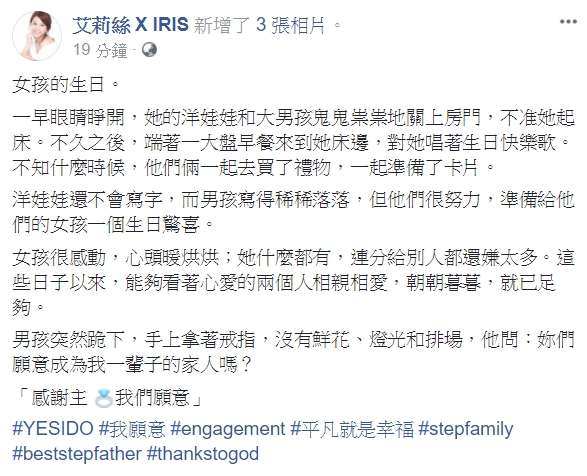 ▼正當她沉浸在驚喜中時,男友突然下跪求婚。他沒有準備鮮花,也沒有安排浮誇的燈光和排場,只是很真摯詢問:「妳們願意成為我一輩子的家人嗎?」她感動回應:「感謝主,我們願意」。艾莉絲已經答應男友的求婚,兩人明年夏天將走進婚姻的殿堂。
