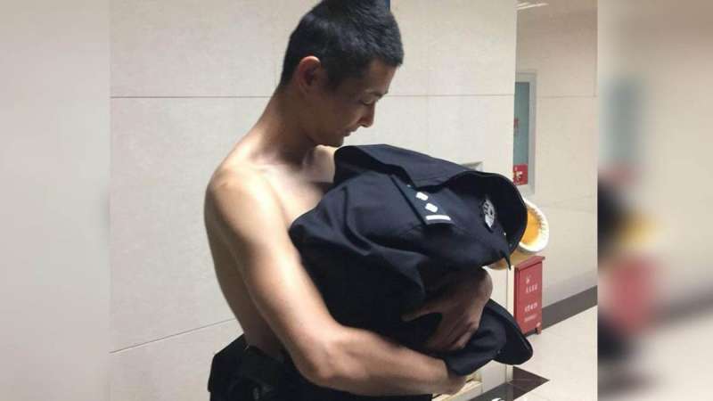 ▼他打赤膊抱著嬰兒,和同事一起來到了醫院。醫生給小嬰兒檢查後,表示他除了飢餓和體溫過低外,沒有其他生理缺陷和外傷。現在小嬰兒孩子在醫院的溫箱接受治療,警方已經開展救援程序,正在尋找他的父母。