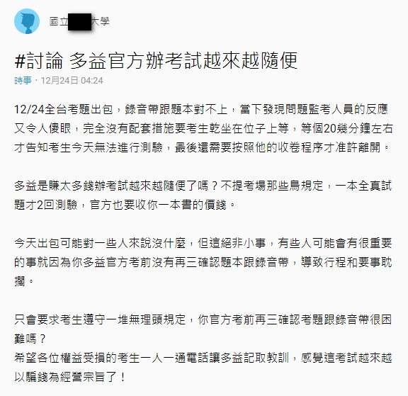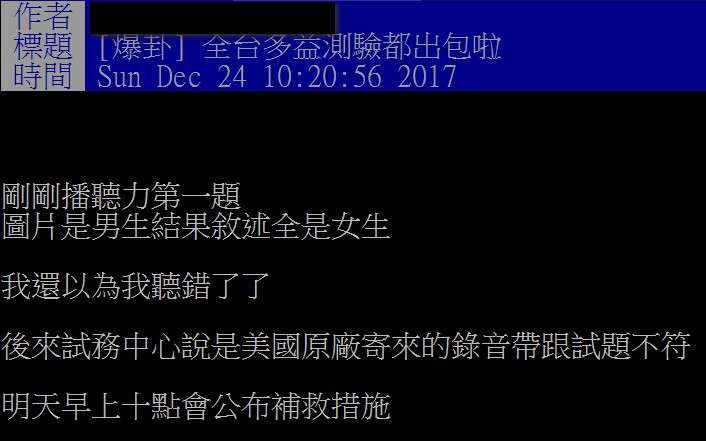 2017年12月25日多益英語測驗(TOEIC)一直都是許多學校和公司用來評估學生或員工英語程度的標準考試,沒想到在2017年的最後一場多益考試竟出現了多益史上首次的出包事件,影響了約2.4萬名報考的考生!