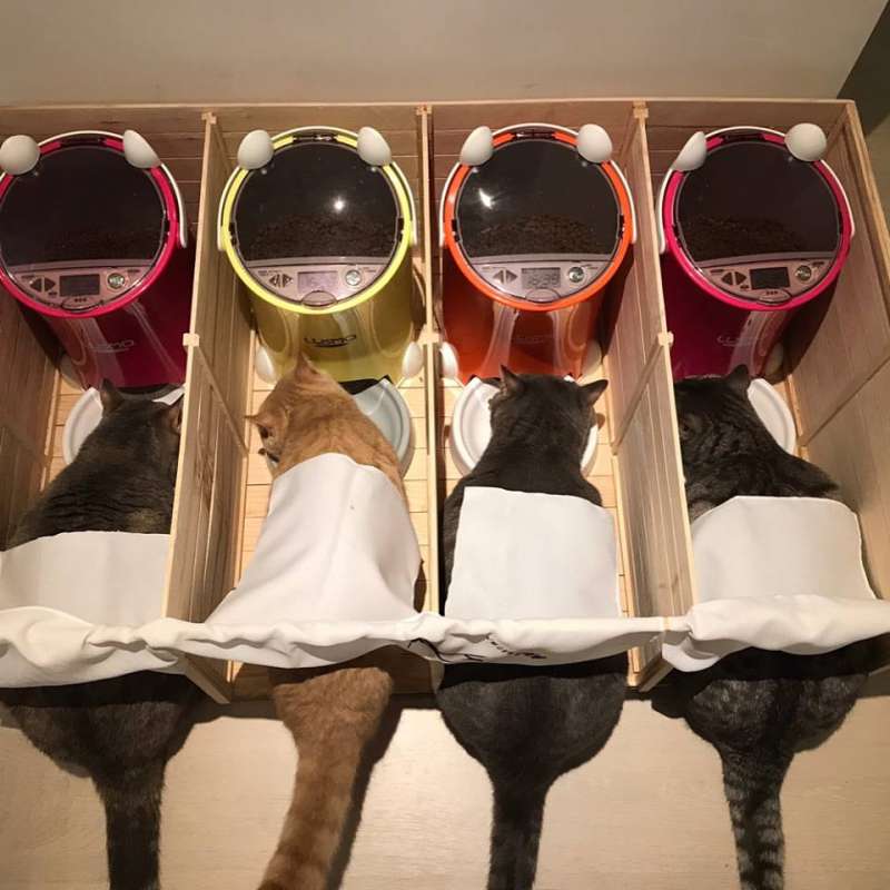 ▼現在貓咪們一隻隻擠進小隔間埋頭大吃,再也不用擔心搶食問題了~