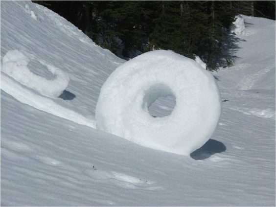▼雪捲:雪地上有很多大大的甜甜圈。其實這是風將雪吹成圓柱形造成的,中間有洞是因為那個位置是結構中最脆弱的,很容易被風吹走。