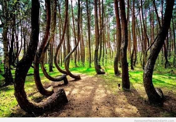 ▼彎曲森林:這些樹是1930年種植的,這片森林中大約400棵松樹向北彎曲,至今人們都沒有找出原因。